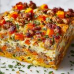 A hearty Sweet Potato Hashbrown Breakfast Casserole featuring tender sweet potatoes, savory sausage, colorful vegetables, and a cheesy egg custard baked to golden perfection. Perfect for a nutritious and satisfying morning meal that serves a crowd.