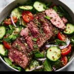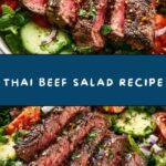A vibrant and flavorful Thai Beef Salad featuring tender grilled flank steak tossed with fresh mixed greens, cherry tomatoes, cucumber, red onion, and fresh herbs, all dressed in a tangy, slightly spicy lime and fish sauce dressing. This salad is perfect for a light yet satisfying main course.