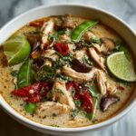 This Thai Chicken Coconut Curry Soup is a fragrant, creamy, and flavorful dish combining tender chicken, fresh vegetables, and aromatic herbs in a rich coconut milk-based broth infused with red curry paste. Perfectly balanced with a hint of lime and fish sauce, this soup offers a delicious taste of Thailand in just 40 minutes.