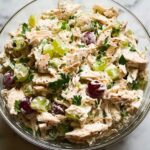 A refreshing and versatile chicken salad featuring tender cooked chicken mixed with a creamy dressing of mayonnaise, Greek yogurt, and Dijon mustard, complemented by crunchy celery, red onion, sweet cranberries or grapes, and nuts. Perfect as a light lunch on its own, in sandwiches, or served over greens.