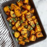 Spread the seasoned squash out in a single layer on your prepared baking sheet. Roast it for 25 to 30 minutes, flipping the cubes halfway through so they brown evenly on all sides. You’ll know it’s done when the squash is tender inside and caramelized to golden perfection outside — the inside is meltingly soft, while the outsides have that irresistible roasted crunch.