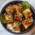 Top your crispy tofu with sliced green onions and a sprinkle of toasted sesame seeds to add fresh color, subtle crunch, and an extra layer of flavor. These garnishes not only look beautiful but also introduce a light sharpness and nuttiness that complement the deep umami taste.