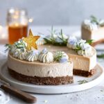 - Decorate and serve: Once set, carefully remove the cheesecake from the springform pan while still frozen. Pipe vegan whipped cream over the top, sprinkle with vegan festive sprinkles, and garnish with fresh rosemary sprigs before serving.