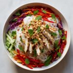 This Vietnamese Crunch Noodle Salad is a refreshing and vibrant dish featuring tender shredded chicken, delicate rice vermicelli noodles, and a colorful medley of fresh vegetables and herbs. Tossed in a tangy and slightly sweet dressing made with fish sauce, lime juice, and brown sugar, this salad offers a perfect balance of savory, sweetness, and freshness. Topped with crunchy roasted peanuts and optional fried shallots, it creates a delightful contrast in textures. Ideal for a light lunch or dinner, this salad is quick to prepare yet packed with authentic Vietnamese flavors.