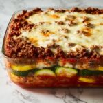 - Layer the Casserole: Preheat the oven to 375°F (190°C). In a baking dish, spread a layer of the beef and tomato mixture evenly across the bottom. Add a layer of sliced zucchini on top, followed by a generous sprinkle of shredded mozzarella cheese. Repeat the layering process if desired, finishing with a top layer of mozzarella.